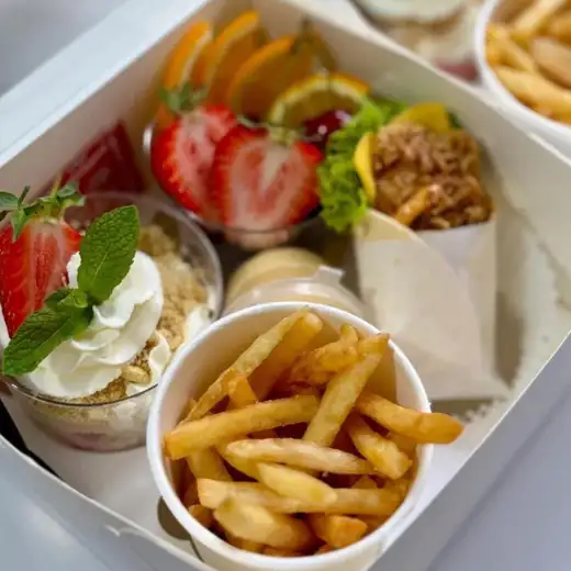 1. Картофель фри 2. Мини-шаурма 3. Фруктовый стаканчик 4. Трайфл с клубникой Соус