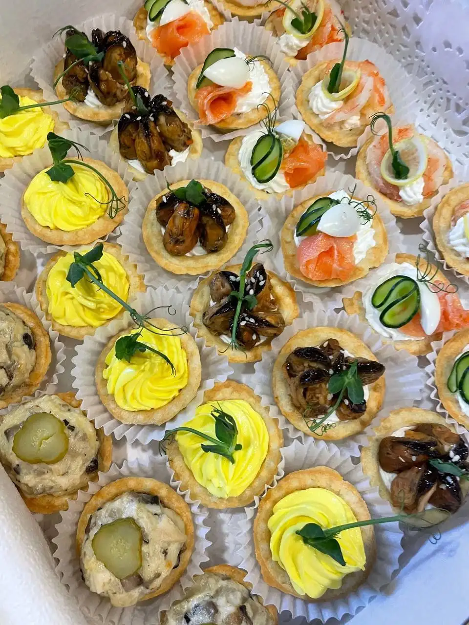 -тарталетка с творожным сыром и креветкой 6 шт -тарталетка с творожным муссом и мидиями 6 шт -тарталетка с творожным сыром форелью и огурцом 6 шт -тарталетка запечённая с курицей и грибами 6 шт -тарталетка с сырно-яичным кремом 6 шт-тарталетка с творожным сыром и креветкой 6 шт -тарталетка с творожным муссом и мидиями 6 шт -тарталетка с творожным сыром форелью и огурцом 6 шт -тарталетка запечённая с курицей и грибами 6 шт -тарталетка с сырно-яичным кремом 6 шт