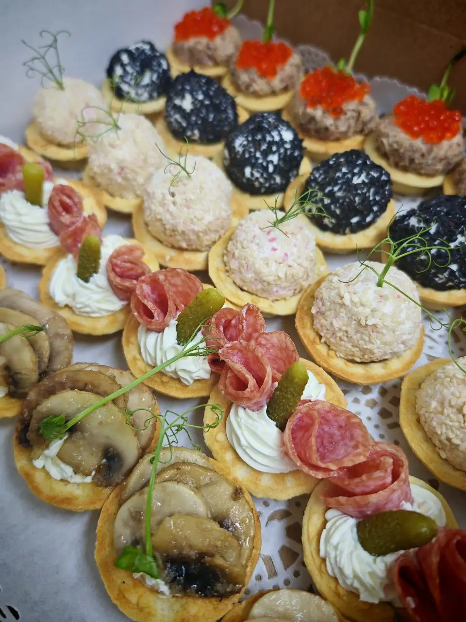- тарталетка, тунец, икра 6 шт - тарталетка, творожный сыр, шампиньоны 6 шт - тарталетка, творожный сыр, с/к колбаса, корнишон 6 шт - тарталетка, творожно-крабовый паштет, кунжут 6 шт - тарталетка, сырный паштет, вяленый томат, кунжут 6 шт