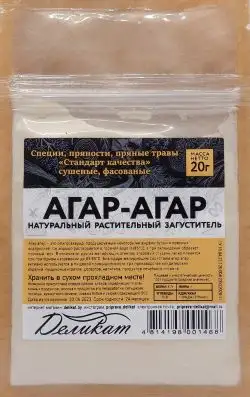 Агар-агар — это олигосахарид, продуцируемый некоторыми видами бурых и красных водорослей Он хорошо растворяется в горячей воде (t≥85°С), а при охлаждении образует прочный гель. В отличие от других желирующих агентов, агаровый студень легко плавится при повторном нагревании до 85-85°С. Его получают из водорослей экстракцией горячей водой. Далее производится щелочная обработка, при которой в осадок выпадают примеси неорганического происхождения. Затем раствор подвергается тонкой очистке последовательным замораживанием и размораживанием, в результате чего из маточного раствора выделяется чистый гель. После сушки получается готовый продукт в виде порошка или хлопьев Благодаря желирующим свойствам агар-агар активно используется в пищевой промышленности при производстве кондитерских изделий, пищеконцентратов, десертов, напитков, продуктов лечебного питания.