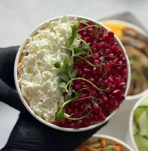 Свинина, морковь по-корейски, сыр, чеснок, майонез, свекла, гранат, яйца