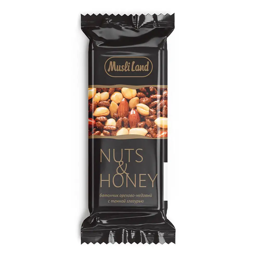 натуральный ароматизатор «Ореховый ликер», патока крахмальная, рис воздушный с какао, соевый лецитин, глазурь кондитерская, масло пальмовое, мёд натуральный, ядро арахиса жареное, ядро миндаля жареное, ядро фундука жареное