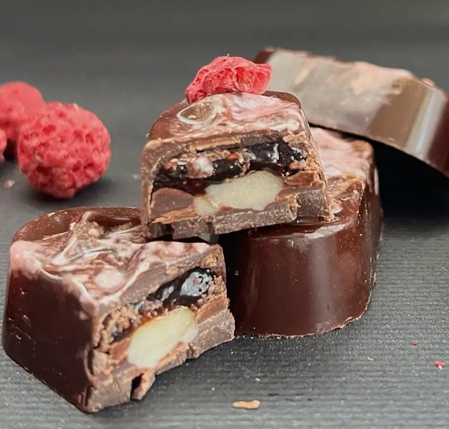 Состав: — Какао тертое — Какао масло — Сироп топинамбура — Кокосовое молоко — Малиновый джем без сахара — Пектин — Сорбит