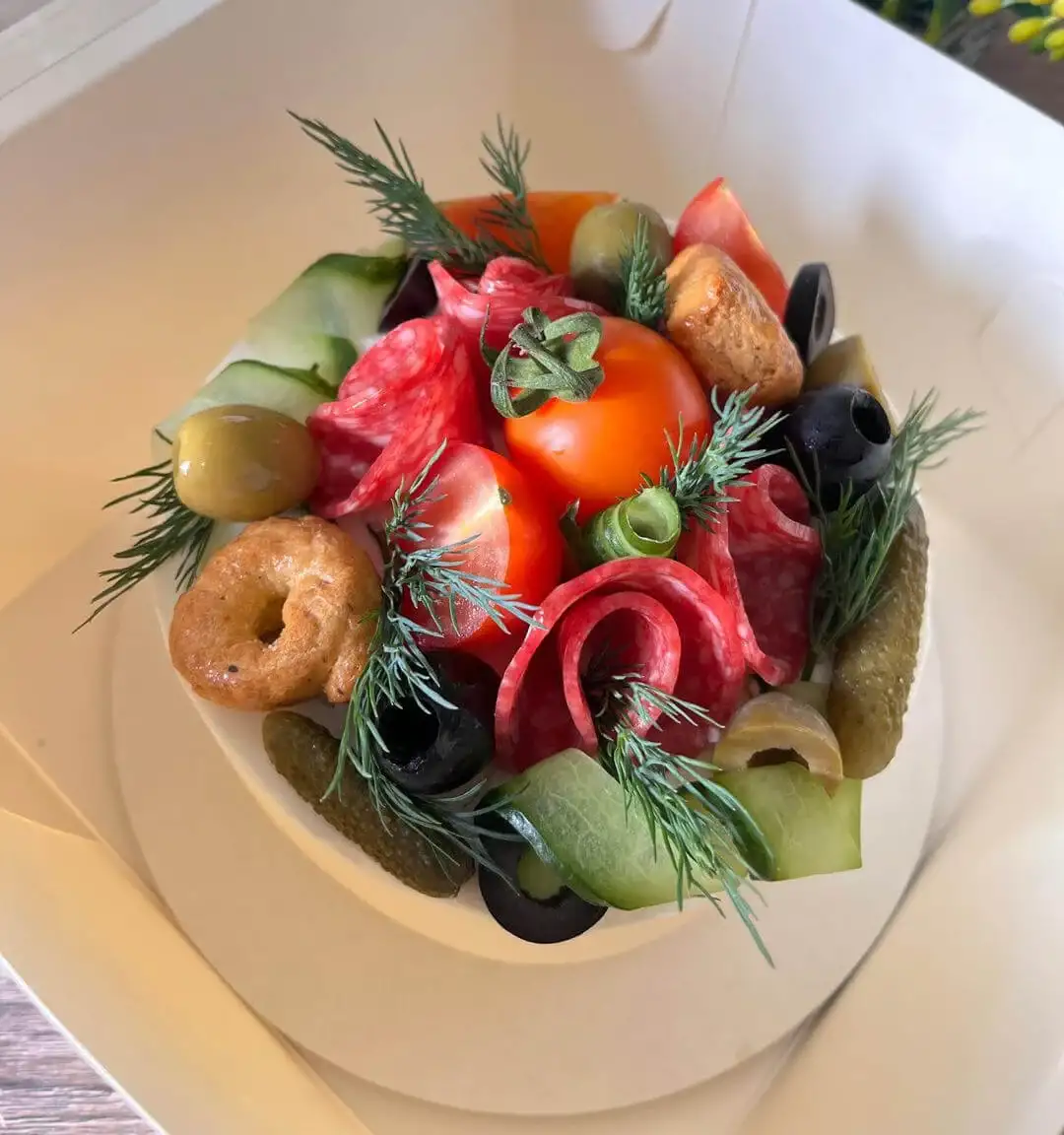 Бисквит с паприкой, сливочно-сырный крем с томатным песто, начинка из рубленой курицы, бекона и томатов Вес: 450-500 г Диаметр: 10 см Высота с декором: 8 см