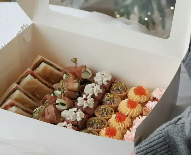 Состав: — сэндвич с индейкой и карамелизированным луком — бриошь с ростбифом и муссом из дорблю — крутон с пастой из маслин и прошутто — тарталетка с клюквенным муссом и дорблю — бриошь с тыквенным муссом и икрой — бриошь с креветкой, карамелизированным луком и фетой