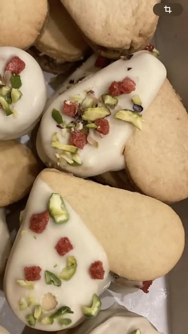 Песочное хрустящее с фисташковой пастой, шоколадом и клубничным крокантом