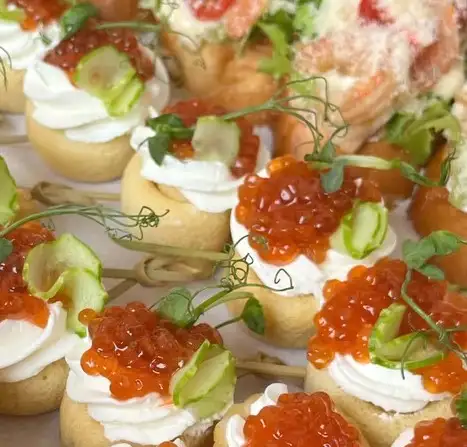 Блинчики, творожный сыр, икра лососевая (горбуши), огурец, микрозелень