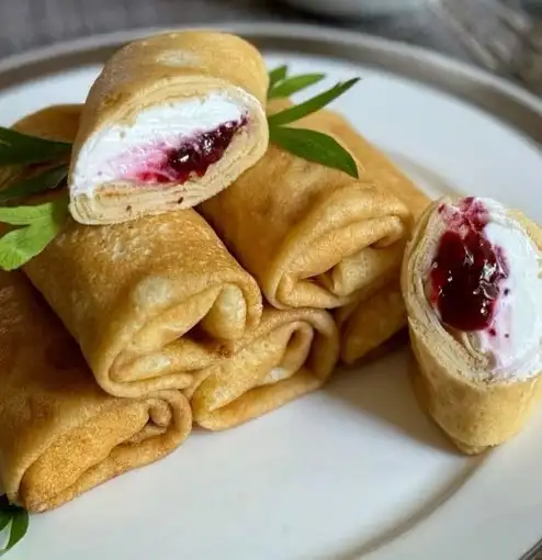 Состав: блинчики ПФ, творожный сыр, малина, сахар
