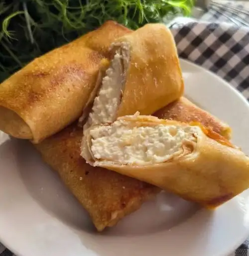 Состав: блинчики ПФ, творог 5%, соль, сахар, ванилин.