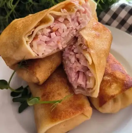 Состав: мука пшеничная, яйца, молоко, вода, соль, сахар, разрыхлитель, масло растительное Начинка: ветчина, сыр