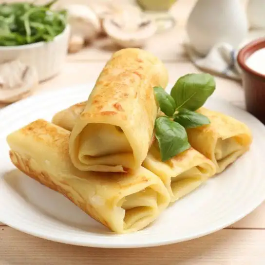 На выбор: — Блинчики с яблоком и корицей 2 шт — Блинчики с творогом 2 шт — Блинчики с ветчиной и сыром 2 шт — Блинчики «Пикантные» (птица, морковь по-корейски, шампиньоны) 2 шт — Блинчики с мясом рисом и яйцом 2 шт