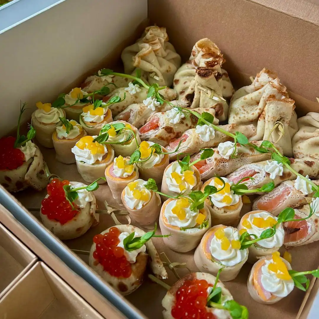 • блинчики с форелью • блинчики с икрой • блинчики с жульеном • блинчики с ветчиной и сыром *Если блинчики с имитацией икры стоимость бокса — 90 руб