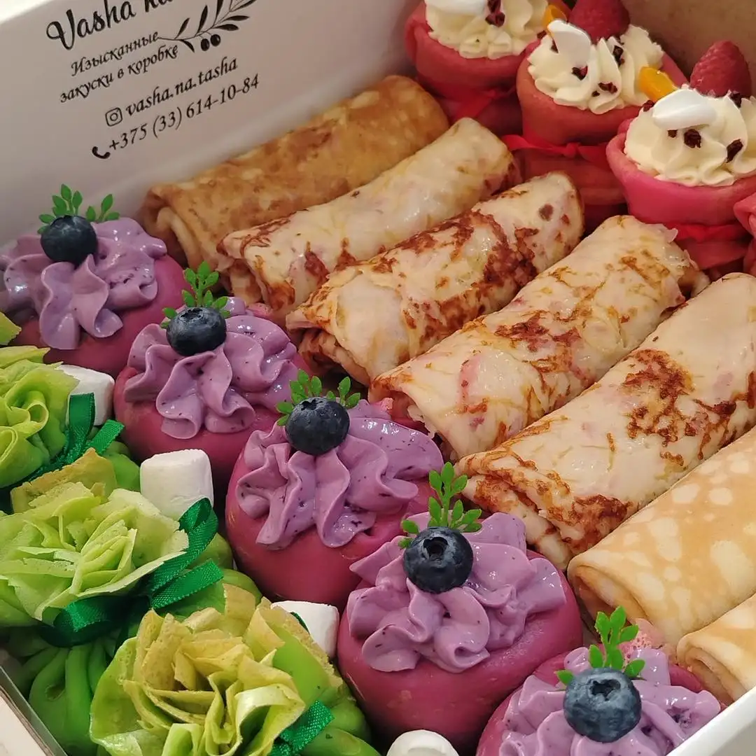 Блинчики шпинатные с форелью — 5 шт Блинчики малиновые — 6 шт Блинчики лавандовые — 5 шт Блинчики с припеком — 7 шт