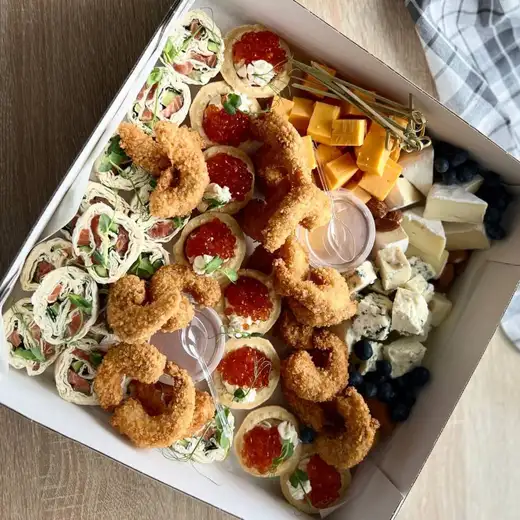 Идеальное сочетание закусок — сыр, креветки в кляре, тарталетка с творожным сыром и икрой, рулетик из лаваша с лососем, а также к сырам прилагается мед, а креветкам кисло-сладкий соус.