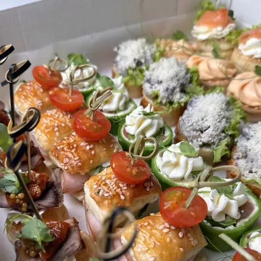 Сет 42 закуски Состоит из: - валованы с сёмгой 7шт - канапе с говядиной 7шт - клаб канапе с карбонадом 7шт - кростини жульен 7шт - тарталетки с креветочным муссом 7шт - шпинатные блины с семгой 7шт