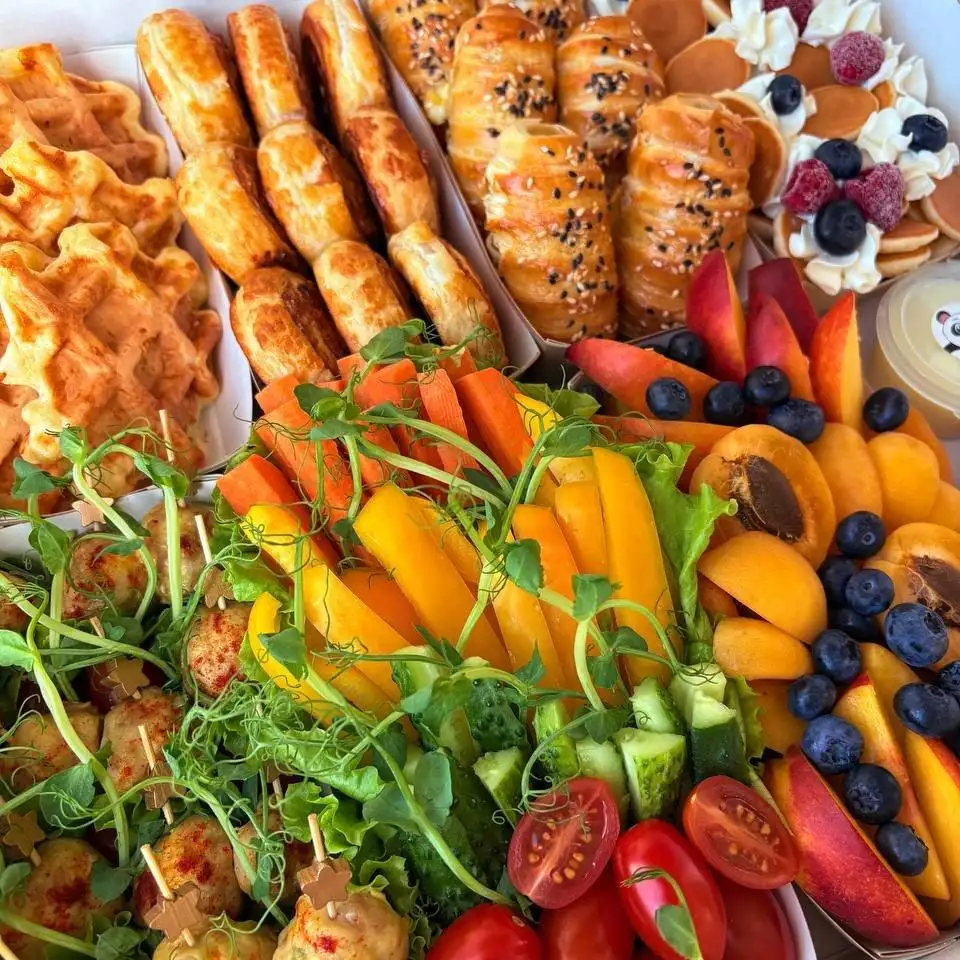 — сырые вафли, 6 шт — мини сосиски в тесте, 6 шт — пиццы-улитки, 6 шт — канапе мит-боллы с черри, 12 шт — мини оладушки с кремчизом — овощная корзинка — фруктовая корзинка — сгущенка, кетчуп, сметан. соус