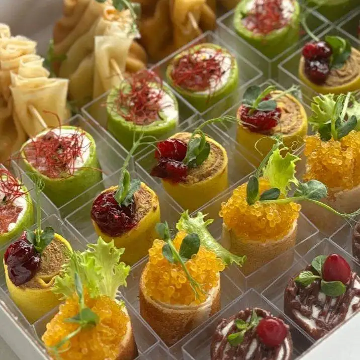 Вес бокса 1500 гр. 1. С икрой 6 шт. 2. Шпинатные с форелью 6 шт. 3. С какао 6 шт. 4. С куриной печенью и клюквенным соусом 6 шт. 5. С жульеном 5 шт.