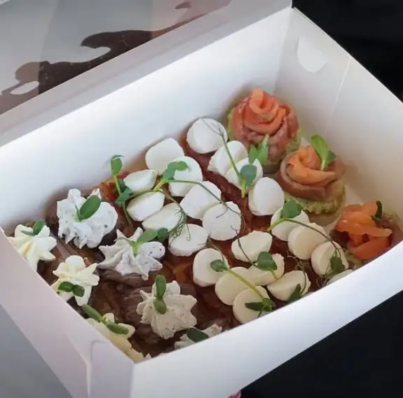 Состав: — бриошь с томатным кремом и моцареллой — тартар из говядины с муссом из пармезана — бриошь с ростбифом и трюфельным муссом — тапас с емгой и авокадо