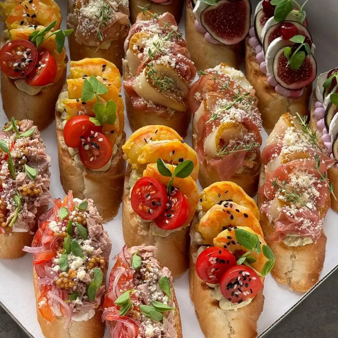 4 вида по 4 штуки: 1. Брускетта с инжиром и сыром Бри 2. Брускетта с грушей и хамоном 3. Брускетта с креветками и черри 4. Брускетта с тунцом и маринованным луком