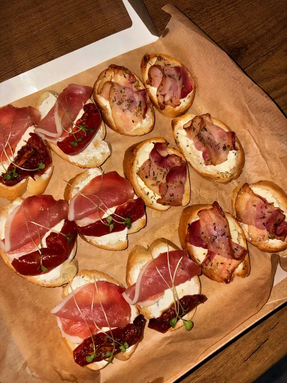 Брускетты с вялеными томатами и хамоном, брускетты с беконом