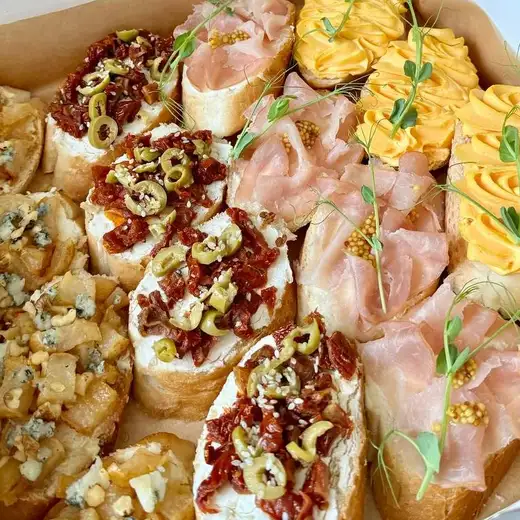 Хрустящие брускетты с сырно-яичным паштетом, с мясом, с вялеными томатами и на десерт брускетта с карамелизированной грушей и грецким орехом. 4 вида брускетт по 4 штуки