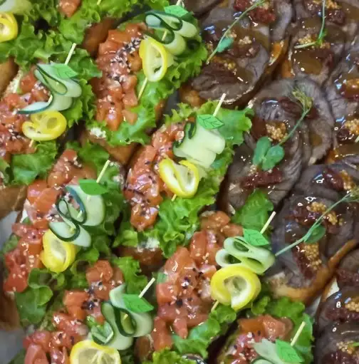 Брускетта со слабосоленой форелью,свежим огурцом и салатом — 10 шт Брускетта с запеченной говядиной и вялеными томатами — 10 шт 1400 гр