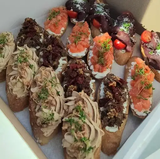 В состав данного бокса входят: ☑️ Брускетта с паштетом ☑️ Брускетта с сырокопченой говядиной ☑️ Брускетта с форелью ☑️ Брускетта с рваной говядиной и вяленными томатами