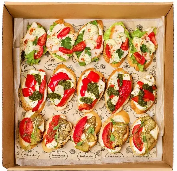 Состав фудбокса «Брускетта Medium» Брускетта с тар-таром из лосося — 5 шт. Брускетта с авокадо и вяленым томатом — 5 шт. Брускетта с прошутто, грушей и джемом — 5 шт. Брускетта с запечённые перцем и фета — 5 шт. Брускетта с моцареллой, томатом и фирменный соусом — 5 шт. Брускетта с курицей и томатом и чесночным соусом — 5 шт.
