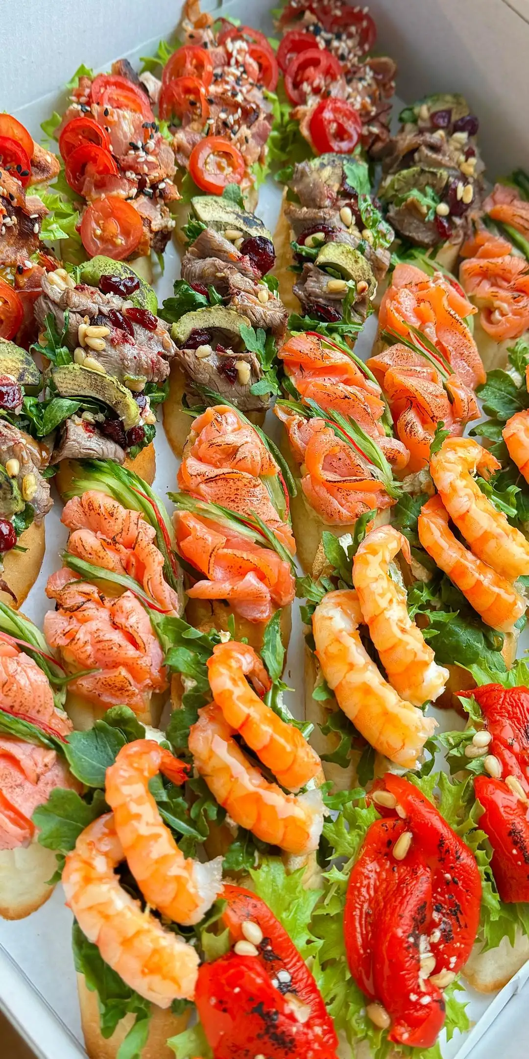 Креветка-авокадо Лосось спайси Говядина с перцем и обоженым авокадо Бекон криспи с черри Печеные перцы с кедровыми орешками