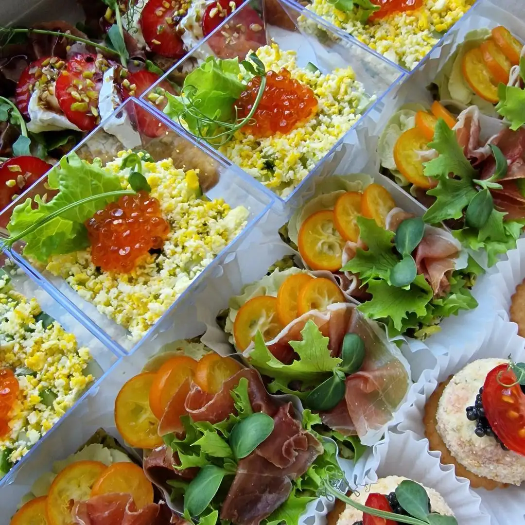 В бок входит: Брускетта с хамоном сыром бри и клубникой- 5 шт. Яично-сырный салат 4 шт. Кабачковый бисквит с хамоном, сыром с авокадо и кумкватом. Монетки с форелью- 5 шт.
