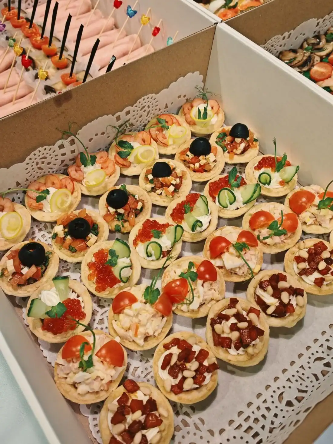 — тарталетка, лимон, сыр творожный, креветка салатная — 6 шт — тарталетка, сыр творожный, томат черри, базилик, маслина, соус-крем бальзамический — 6 шт — тарталетка, курица копченая, яйцо отварное, перец болгарский, майонез — 6 шт — тарталетка, лосось слабосоленый, сыр творожный, икра — 6 шт — тарталетка, сыр творожный, тыква, прованские травы, орех кедровый — 6 шт