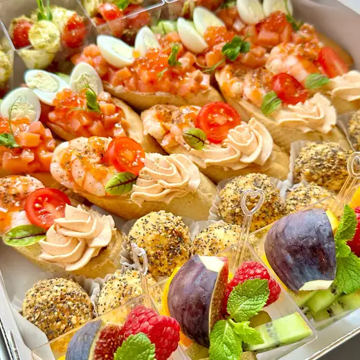 Брускетта с форелью Брускетта с креветками Чизбол с виноградом в ореховой панировке Салат капризе Фруктовые стаканчики