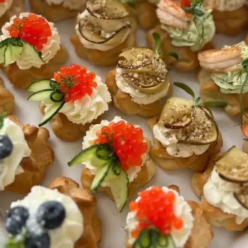 — С муссом из цыпленка и хрустящими луком — С кремом из базилика и креветкой — С кремом дор блю и грушей — С крем чиз и ягодой — С красной икрой