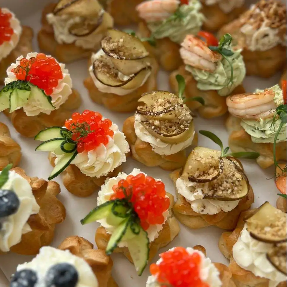 С муссом из цыплёнка и хрустящим луком С кремом из базилика и креветкой С кремом дорблю и грушей С красной икрой С крем чиз и (сезонной) ягодой (фруктом)