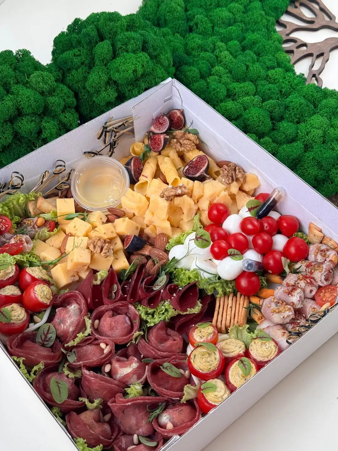 Грудинка сырокопченая, балык, чечилл, сыр в нарезке, моцарелла, пармезан, хлебцы, черри, декор Бокс рассчитан на 8−10 человек. Вес около 2 кг