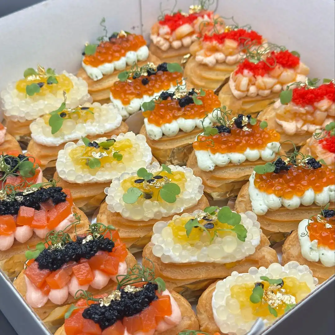 Эклер с креветкой и томатным муссом — 6 шт. Эклер с икрой брют и манго маракуйя — 6 шт. Эклер с красной икрой сливочным зимним муссом и лососем — 6 шт. Эклер с лососевым муссом и икрой палтуса (либо имитация) — 6 шт.