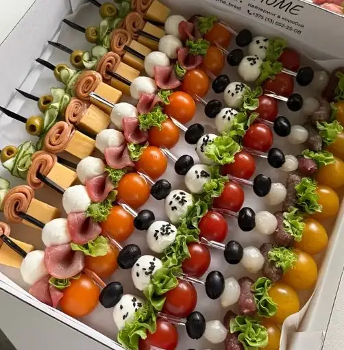 1. Черри, колбаска, моцарелла, салат, 10 шт 2. Маслина, мини-лучок, мини-колбаска, черри,10 шт 3. Чиз бол с колбасой, 10 шт 4. Маслина, черри,салат, моцарелла, 10 шт
