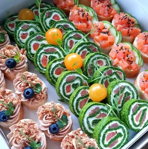 1. Шпинатный рулет с форелью 18 кусочков (500 гр) 2. Кростини с форелью и огурцом, 10 шт 3. Кростини с нежным паштетом и хрустящим лучком, 10 шт Коробка 30×30