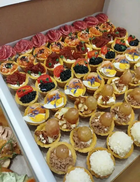 Минитарталеток с салями, с форелью, с вялеными томатами, с икрой имитацией, с креветками, со сладким кремом (сезонная ягода), с камамбером, мёдом и грецкими орехами, с рафаэлло вес — 1 кг 64 штуки 8 видов по 8 штук