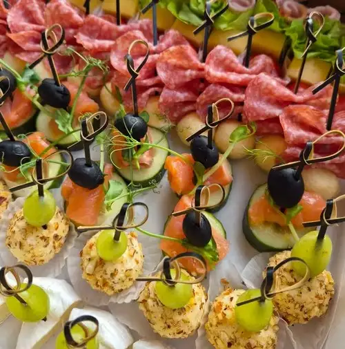 Канапе с карбонатом,сыром и черри 10 шт Канапе с салями и сырным шариком 10 шт Канапе с форелью,огурцом и оливками 10 шт Канапе с виноградом и чизболлом в орехах 8 шт Канапе с сыром бри/камамбер,фруктами/ягодами (по сезону) 8 шт