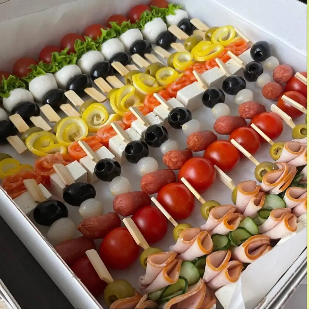 4 вида по 5 шт. — с форелью — с ветчиной — с моцареллой и черри — с мини колбасками.