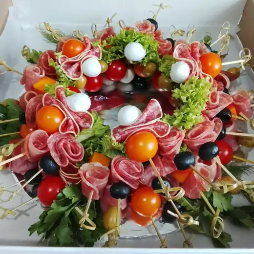 Канапе: салями, оливки, черри, маслины, сыр моцарелла, салат, карбонат, балык