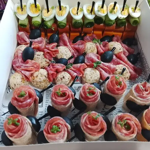 Бокс «Канапешки» состоит: розочки из тортильи (с салями); чизболлы с маслиной и салями; канапе с сыром и охотничьей колбаской