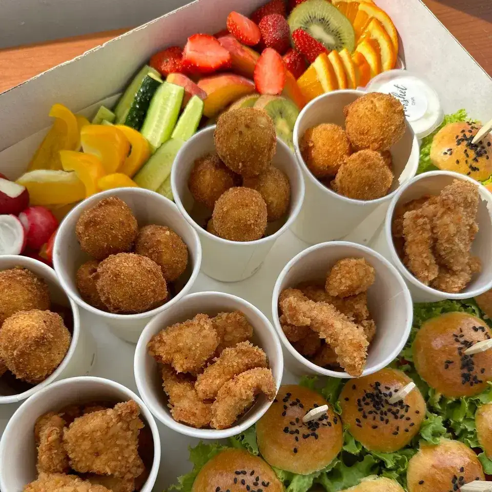Мини-бургеры, 14 шт Сырные шарики, 4 стаканчика Нагетсы, 4 стаканчика Фруктовая корзинка Овощная корзинка Соусы, 6 шт