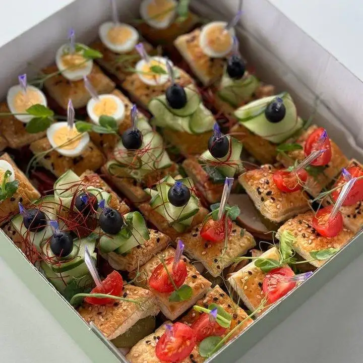 Вес бокса — 1 кг. — с салями и солёным огурчиком — с форелью и творожным сыром — с ветчиной и черри.