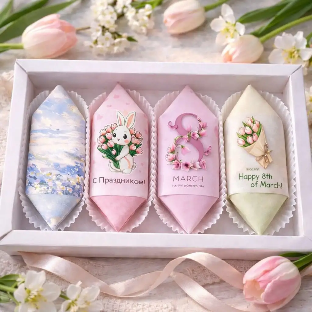 Пирожное картошка в виде упаковки конфет. Обертки из сладкой съедобной сахарной бумаги. Начинки: — Классическая — Малина — Клубника — Клюква — Смородина — Тирамису — Орео — Маршмеллоу — Банан