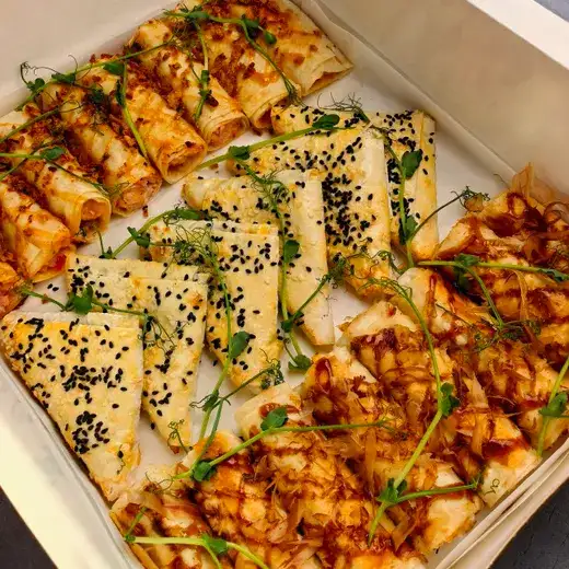 Бокс закусок из лаваша (24 шт.) Ассорти из трех видов: 1. «Деревенские» конвертики с сулугуни — 8 шт. Тянется настоящий грузинский сыр с томатом и зеленью. 2. «Морские» трубочки с крабом — 8 шт. Нежный вкус крабовых палочек, сливочный сыр и легкий чесночный акцент. 3. «Классические» трубочки с ветчиной и сыром — 8 шт. Самая популярная начинка: много сыра и отборная ветчина. Идеально для фуршета, перекуса или как дополнение к основному блюду!