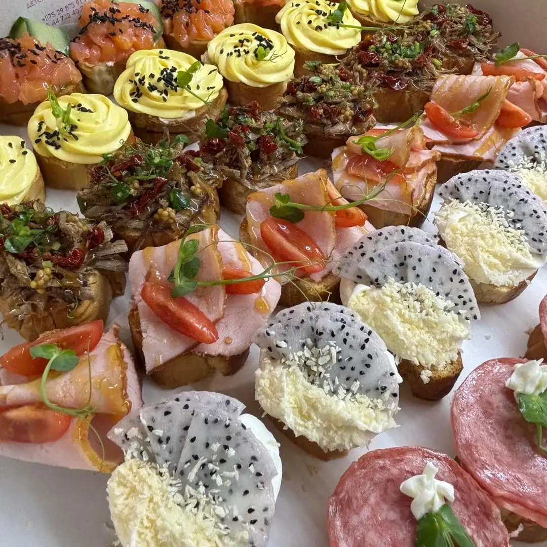 С яично-сырный паштетом С карбонадом С лососем С ягодами (по сезону) С салями С говядиной и вялеными томатами В боксе 36 шт