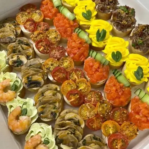 Кростини с говядиной — 6 шт Кростини с форелью — 6 шт Кростини с сырно-яичным паштетом — 6 шт Кростини с запеченными черри — 6 шт Кростини с шампиньонами — 6 шт Кростини с креветкой — 6 шт