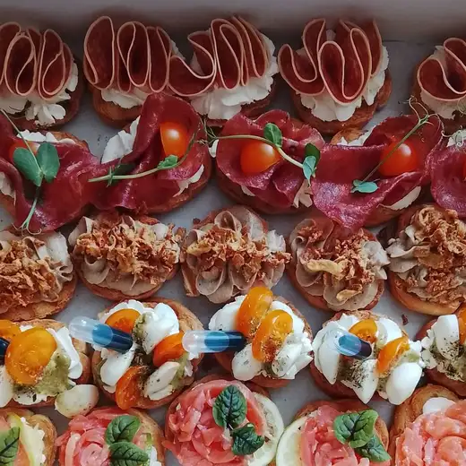 В бокс входят брускетты: Капрезе — 5 шт С форелью — 5 шт С с/к колбаской — 5 шт С паштетом — 5 шт С сезонной ягодой — 5 шт С ветчиной/брезоллой — 5 шт